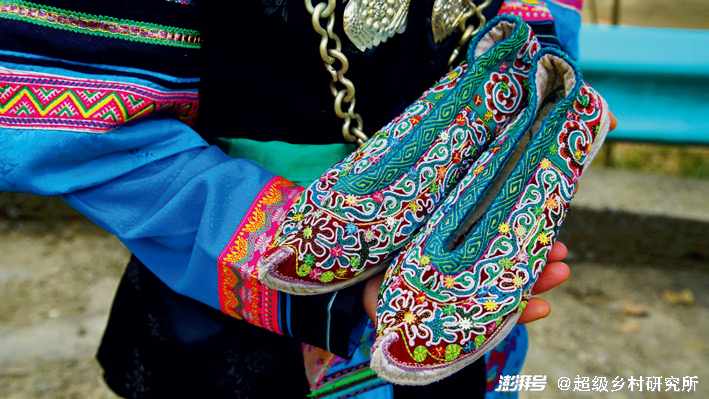 一双漂亮的翘尖鞋,往往是水族女性在展现自我时,不可缺少的一个亮点。由于翘尖鞋的布料面积较小,所以马尾绣一般采用通篇绣制花纹的模式。另外翘尖鞋通常会采用植物纹样、动物纹样以及几何纹样,使用亮丽的色彩,以达到绚丽的效果。