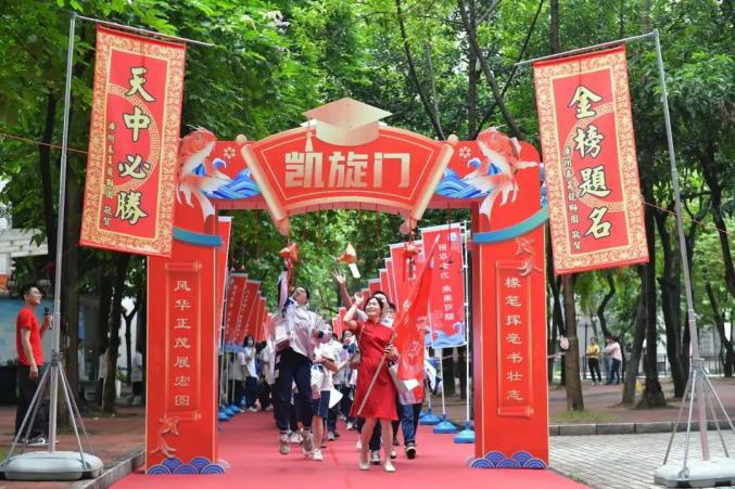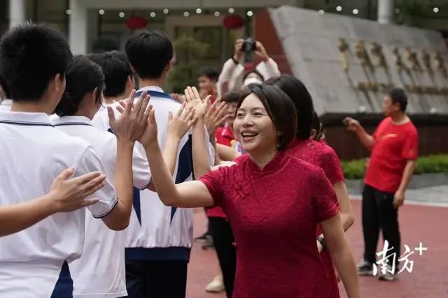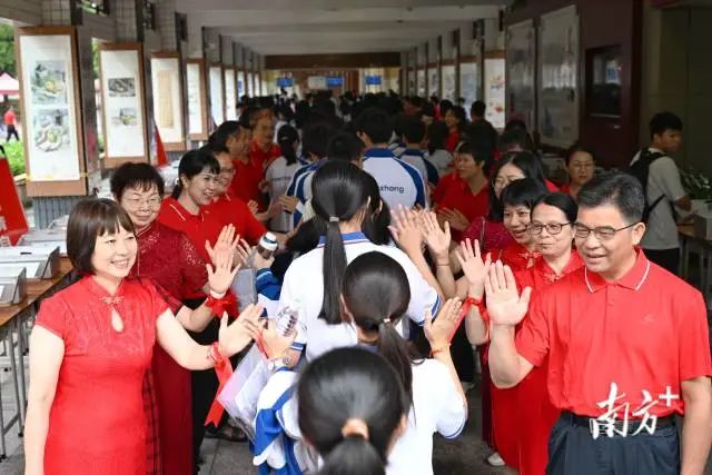 广州市天河区天河中学考点,老师与考生们击掌鼓气。
