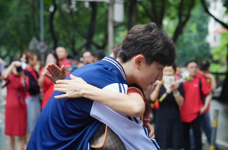 在广州市铁一中学的门口,一位妈妈在进考场前,拥抱孩子为孩子打气加油。
