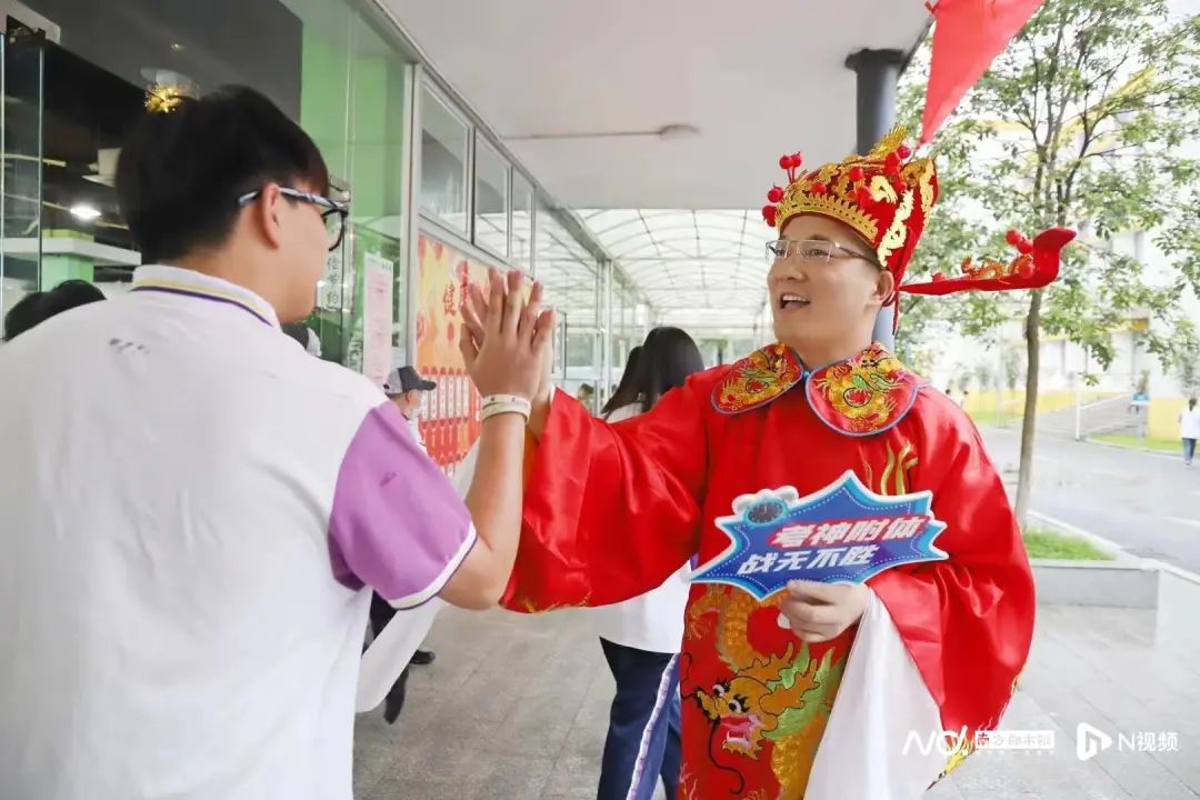 有学弟学妹装扮成“文曲星”与考生击掌拥抱