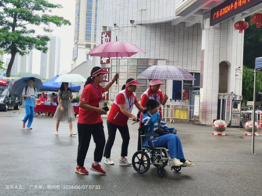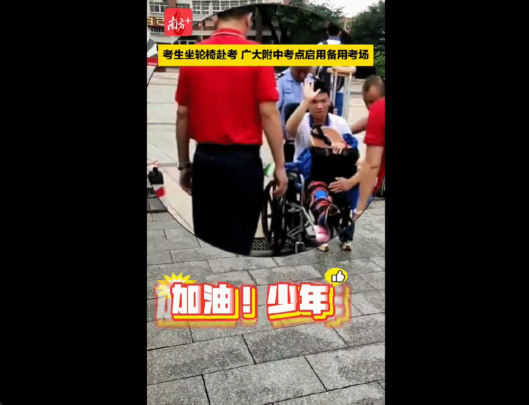 在惠州,青年志愿者护送骨折考试顺利到达考场。