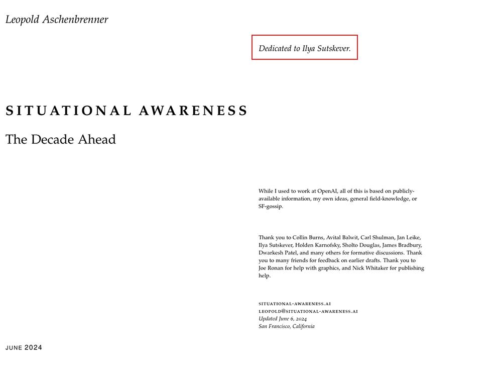 阿申布伦纳在这份文件的开头特别致敬了前OpenAI首席科学家伊尔亚·苏茨克维(Ilya Sutskever)和其它OpenAI超级对齐团队的成员。在伊尔亚从OpenAI淡出直到离职的几个月中,众多网友都发出疑问:伊尔亚究竟看到了什么?或许这份文件能让我们从顶尖AI研究者的视角,一窥未来AI的发展趋势。