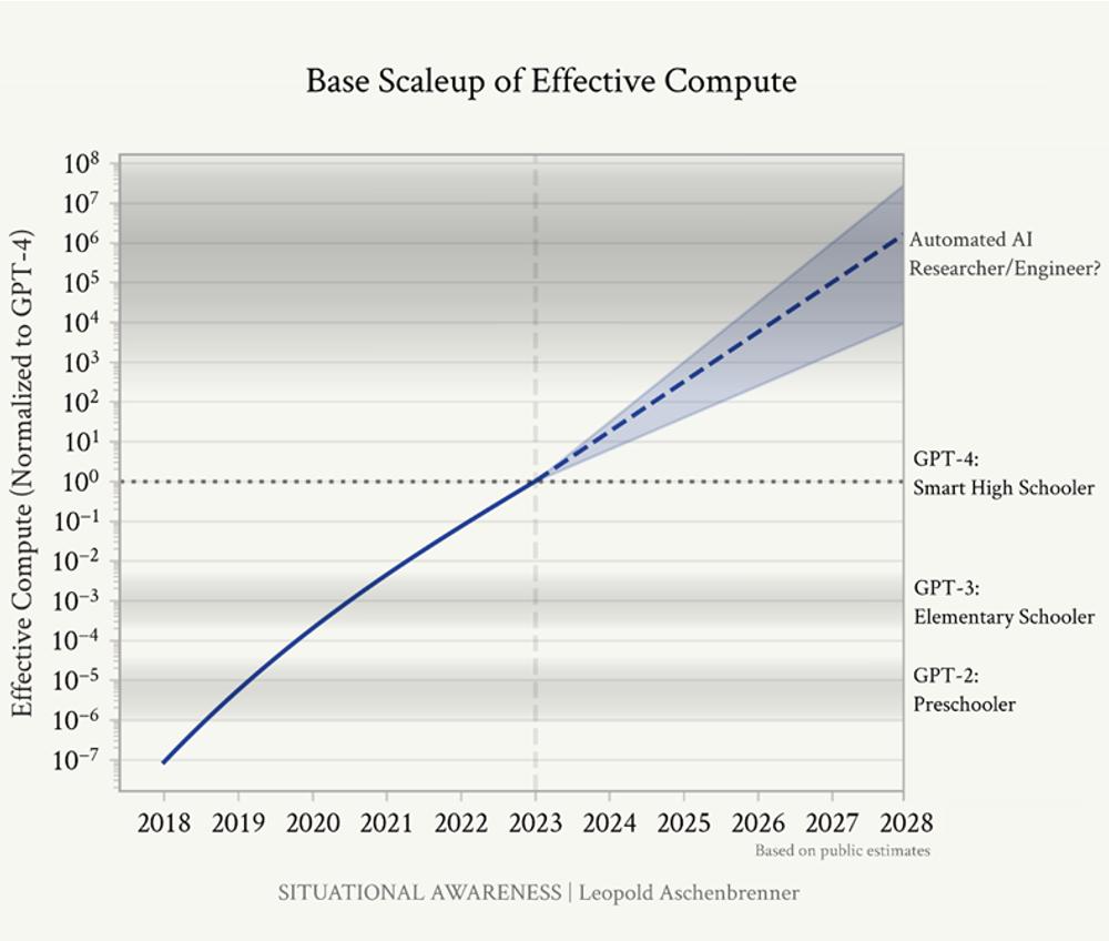 阿申布伦纳将他的这份文件命名为《态势感知》(Situational Awareness),他认为目前全世界只有仅仅几百人对AI的发展有真正意义上的感知,并且大多集中在旧金山地区以及全球各地的AI实验室里,而自己便是这几百人中的一员。主流专家们目前还停留在AI仅仅是“下一词预测”的认知上,但AI或许会成为一场远超互联网的宏大的技术变革。