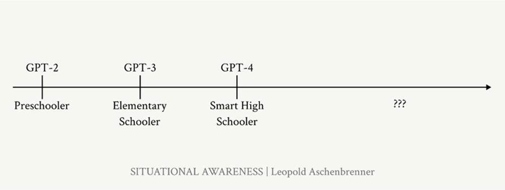 阿申布伦纳对AI水平发展的估计参考了GPT-2到GPT-4的发展趋势。2019年的GPT-2模型可以简单地串起一些看似合理的句子,但是却无法从1数到5,也无法完成总结类任务。GPT-2模型的水平大概与学龄前儿童相仿。