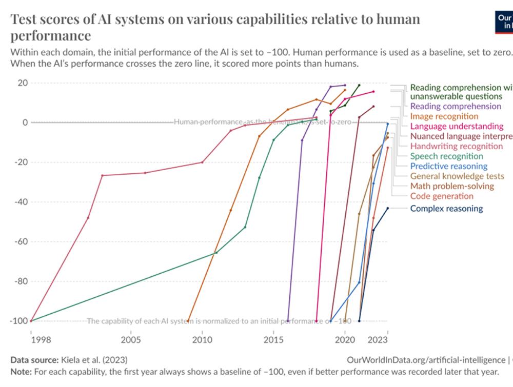 上图显示,AI正在以极快地速度在诸多基准测试中取得超越人类水平的表现。阿申布伦纳称,目前广泛使用的MMLU基准测试的设计者认为这个测试能经受住时间的考验,但仅仅3年后,像GPT-4和Gemini这样的模型就已经获得了约90%的正确率,远超大部分人类的表现。