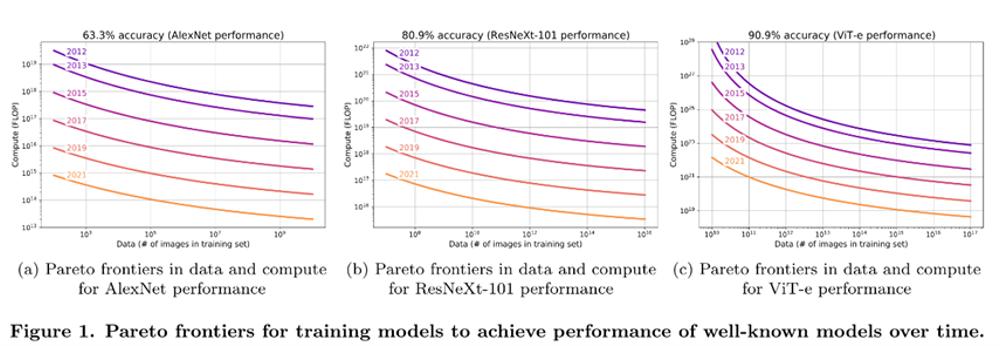 这种范式内的算法改进速度是几乎不变的。ImageNet的最佳数据显示,2012年-2021年的9年期间,计算效率持续以每年0.5个数量级的速度提升。这意味着4年后,我们可以用现在1%的计算量实现相同的性能。