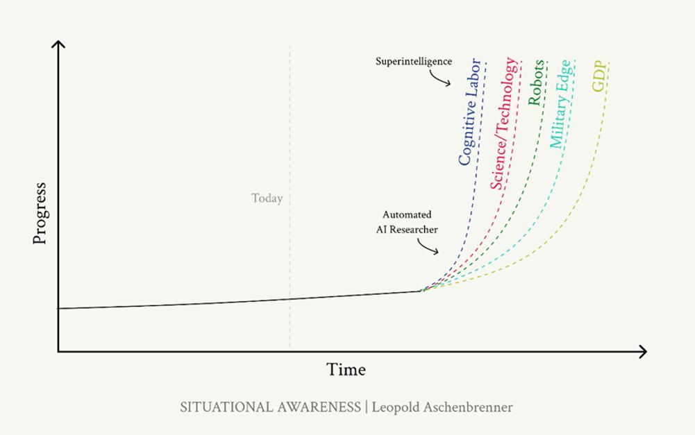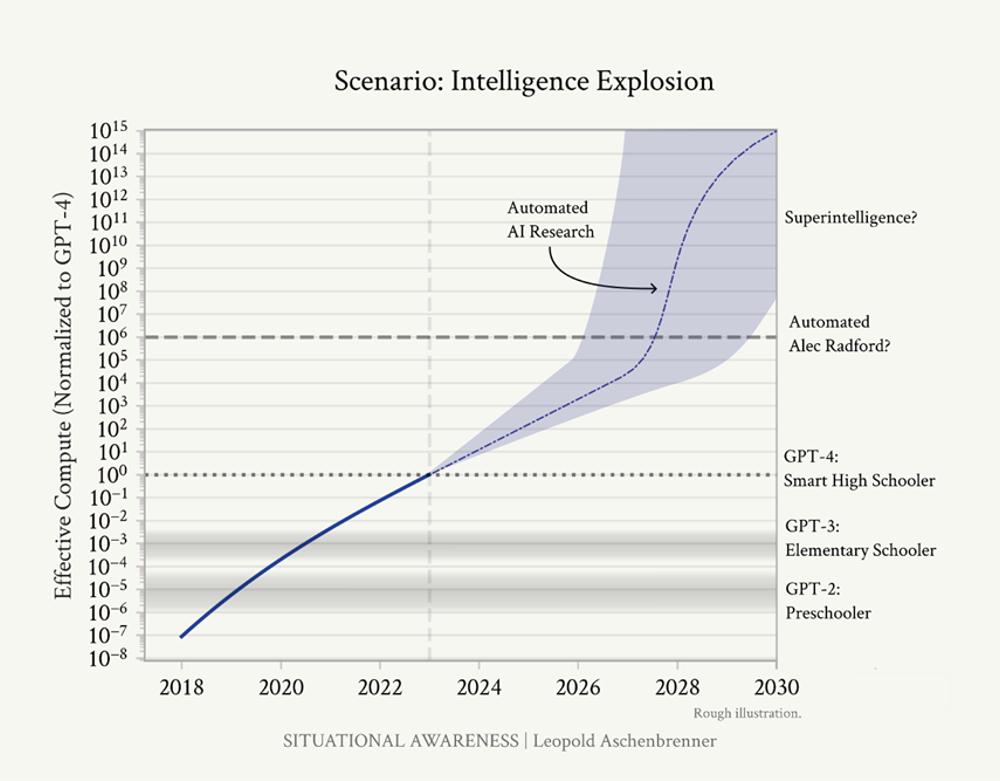 阿申布伦纳认为,AGI(通用人工智能)的竞赛已经悄然开始,我们有很大概率将在2027年实现AGI系统。并且,AI系统并不会在达到人类水平后就止步不前,而是会在数以亿计的AGI带领下实现自动化的AI研究,或许能在1年时间内做出原本10年才能实现的算法进步,我们或许会在2030年左右迎来真正意义上的超级智能。