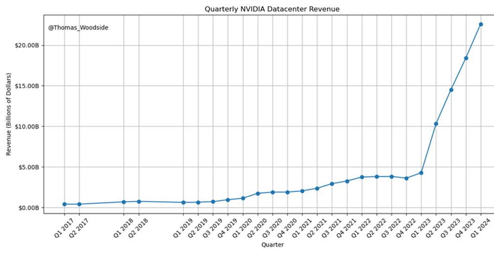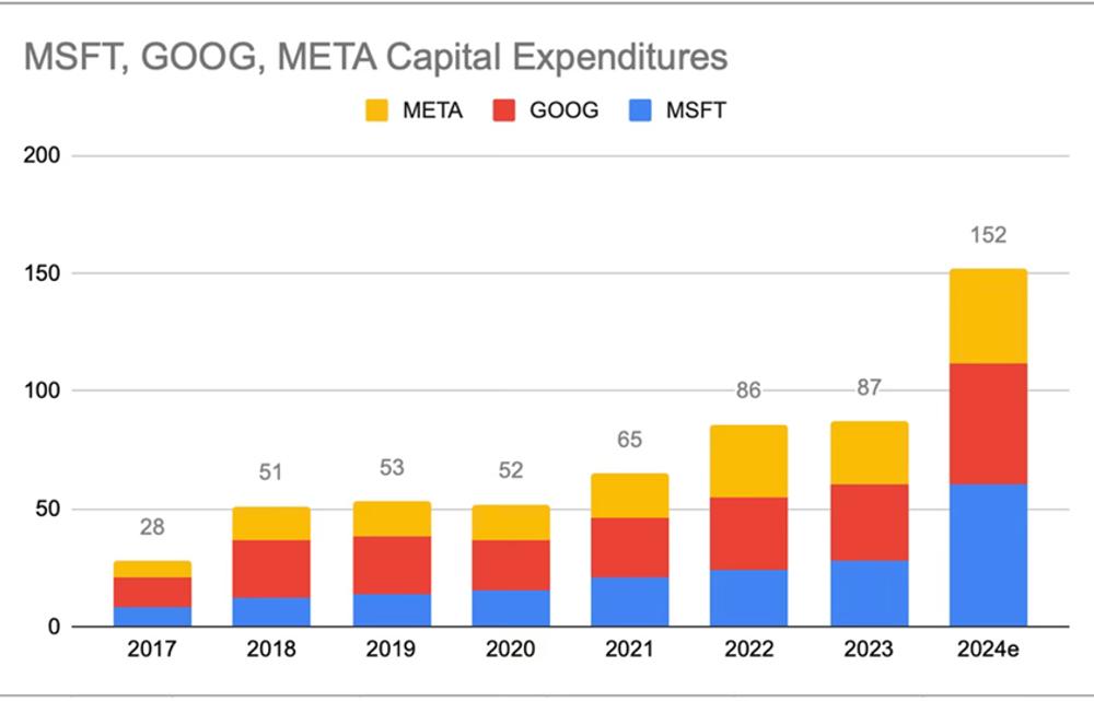 大型科技公司也一直在大幅增加资本支出:微软和谷歌的资本支出可能会超过500亿美元,亚马逊云科技(AWS)和Meta今年的资本支出可能会超过400亿美元。虽然这些支出并非全部用于AI,但由于AI的蓬勃发展,它们的资本支出总额将同比增长500-1000亿美元。这些公司还在削减其他资本支出,将更多支出转移到AI上。此外,其他云提供商、公司和国家也在投资AI。