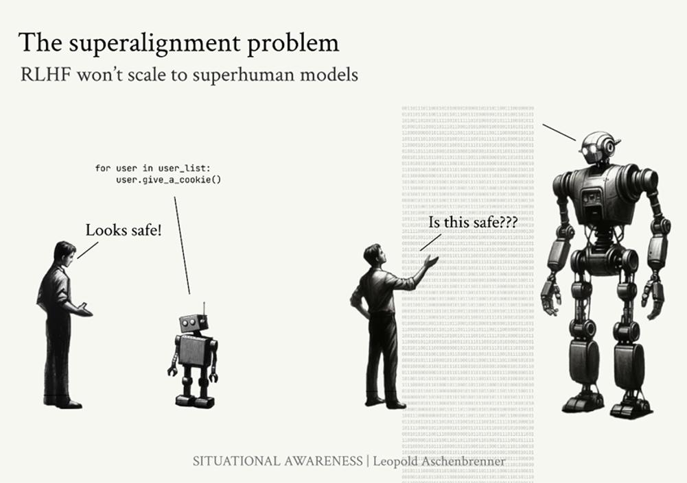 但随着AI系统变得更加智能,RLHF将会崩溃,我们将面临全新的、性质不同的技术挑战。想象一下,一个超人类水平的AI系统用它发明的一种新编程语言生成一百万行代码。人工评估员根本无从知晓这些代码背后是否存在问题,他们无法做出好或坏、安全或不安全的评价,因此也无法通过RLHF强化良好行为并惩罚不良行为。