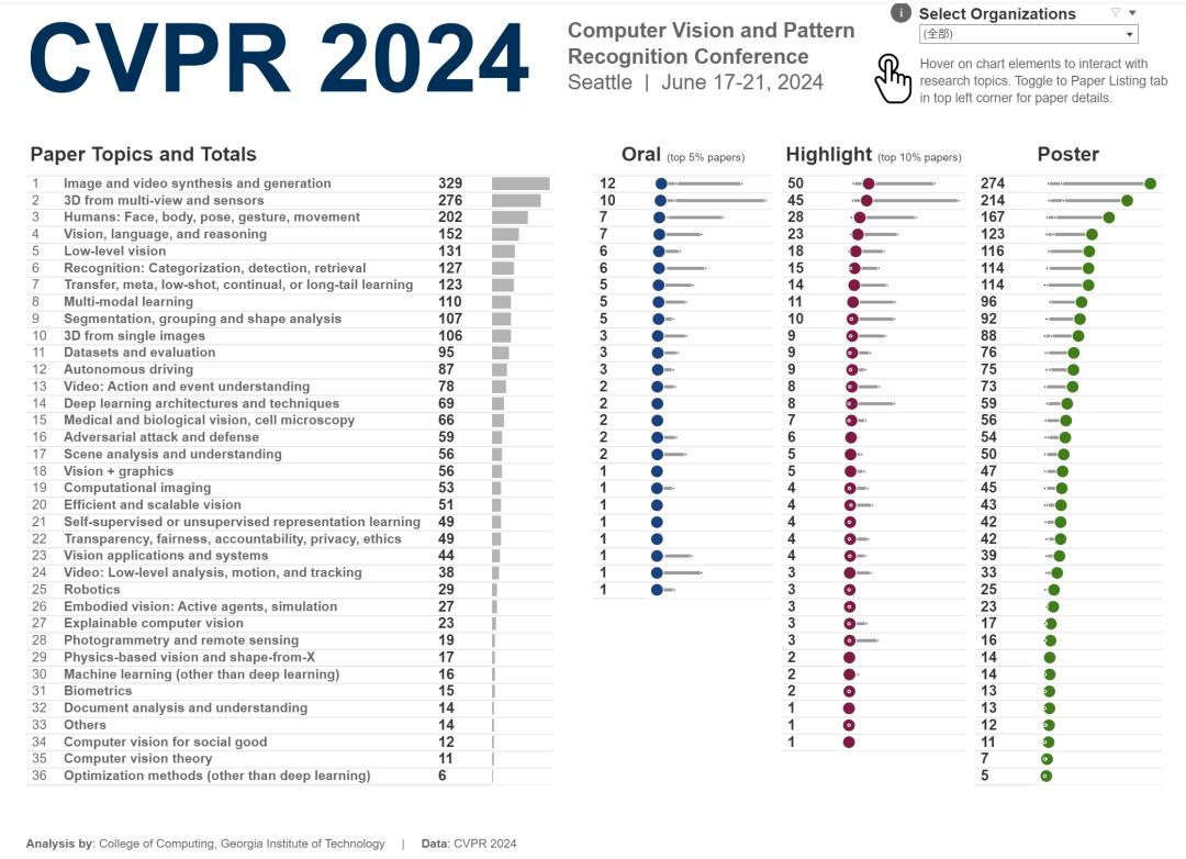 最近,乔治亚理工学院计算机学院(College of Computing, Georgia Institute of Technology)对 CVPR 2024 录用数据的统计分析,直观呈现了当前计算机视觉领域的研究热点分布情况。