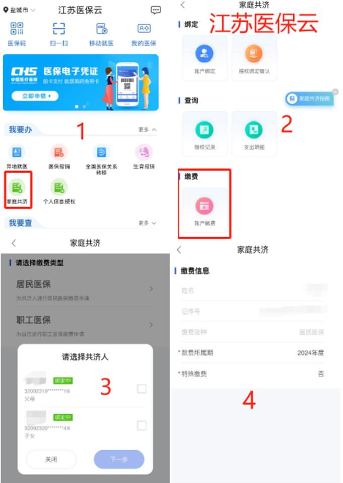 4.医保个账代缴:通过“江苏医保云”-“我要办”-“家庭共济”-“账户缴费”为已绑定的“家庭共济关系”的家庭成员(居民/未成年人)直接代缴城乡居民医保费。
