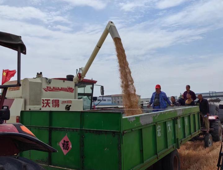 当日上午,在城港路街道小原王家村,一片片金黄的麦田,大型收割机正开足马力,在麦田中忙碌穿梭,一垄垄成熟的小麦被卷进机器,收割、脱粒、粉碎秸秆一气呵成,金黄色的麦粒“尽入囊中”,只留下整齐的麦茬。金黄的麦粒堆成小山,村民们脸上洋溢着丰收的喜悦。风吹麦成浪,蝉鸣夏始忙。为保障夏粮收获,我市组织162个农机服务组织投入一线抢收,农业技术人员深入田间地头,参与“三夏”会战,指导农户做好小麦收获前的田间管理,看着村民脸上荡漾着丰收的喜悦,莱州市农技推广中心主任介绍说,今年以来,莱州市积极运用小麦促弱转壮各项手段,采取了宽幅精量播种、水肥一体化、一喷三防等一系列粮食单产提升的技术措施,终于迎来了夏粮丰收的关键时刻。