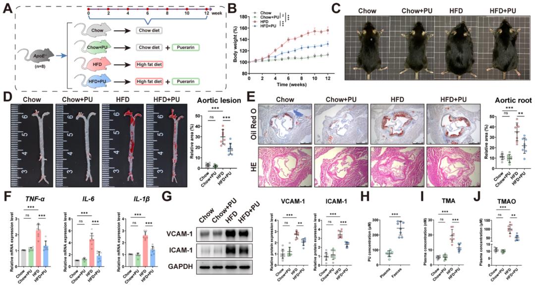 在这项研究中,研究团队首先利用自发性动脉粥样硬化小鼠模型(ApoE−/−)观察补充葛根素的治疗效果。