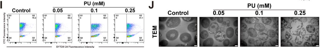 经过粪便移植实验,研究团队发现葛根素的效用确实依赖于肠道菌群。进一步研究表明,葛根素能够调整肠道菌群结构,特别是降低粪便普雷沃氏菌Prevotella copri(P. copri)的定植。基因分析结果显示,葛根素能够下调P. copri的细胞膜相关基因表达,导致P. copri细胞膜变形和内部气泡增加,从而阻碍P. copri在肠道立足。