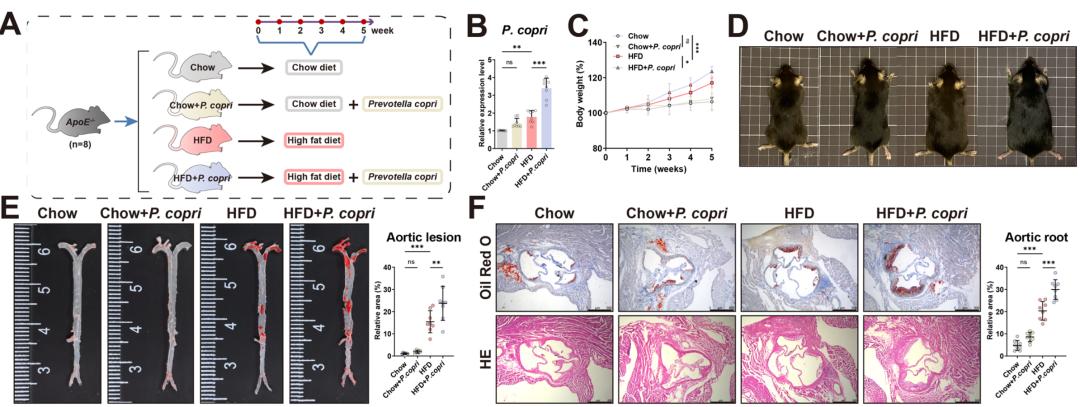 研究团队利用小鼠实验验证,表明P. copri对于动脉粥样硬化来说真不是什么好菌。口服P. copri五周后,高脂饮食的动脉粥样硬化小鼠表现出更严重的病情,体重增加、主动脉斑块病变面积增加、TMAO血浆水平增加。