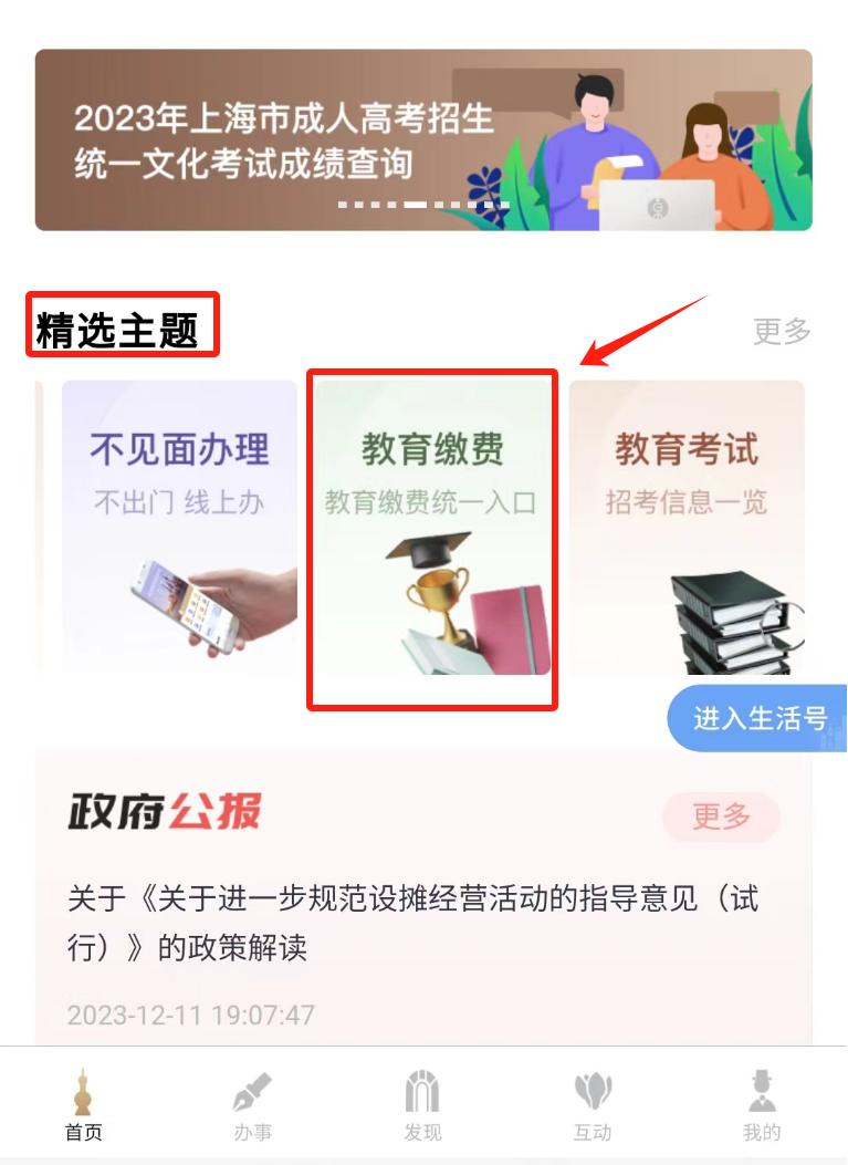 缴费入口:打开“随申办市民云”APP,在首页【精选主题】中找到“教育缴费”,或通过关键词搜索“教育缴费”,选择“教育缴费专区”事项,即可进入服务。