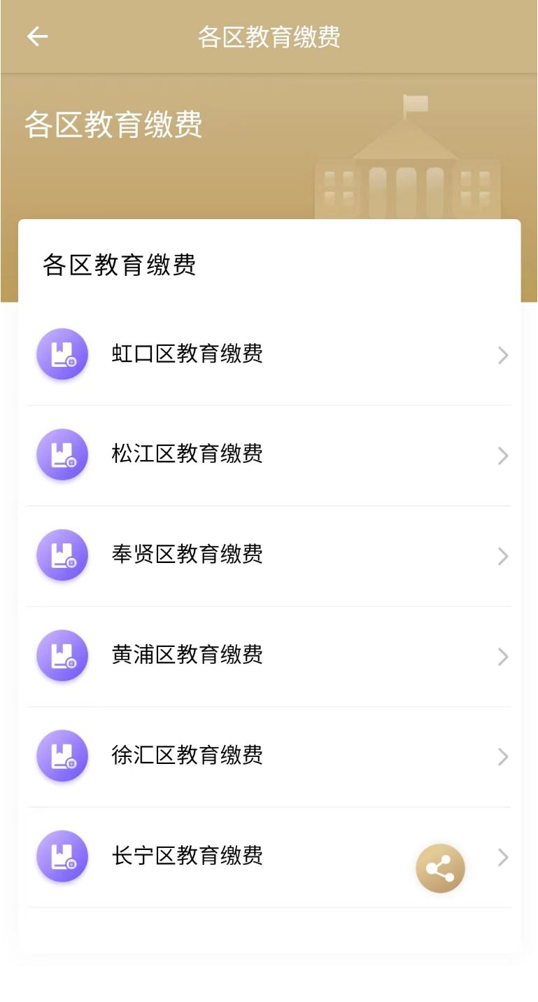 各区教育缴费1、点击“各区教育缴费”,选择就读学校所在区,进入对应缴费平台。目前已支持松江、黄浦、徐汇、长宁、虹口、奉贤区统一在线缴费。