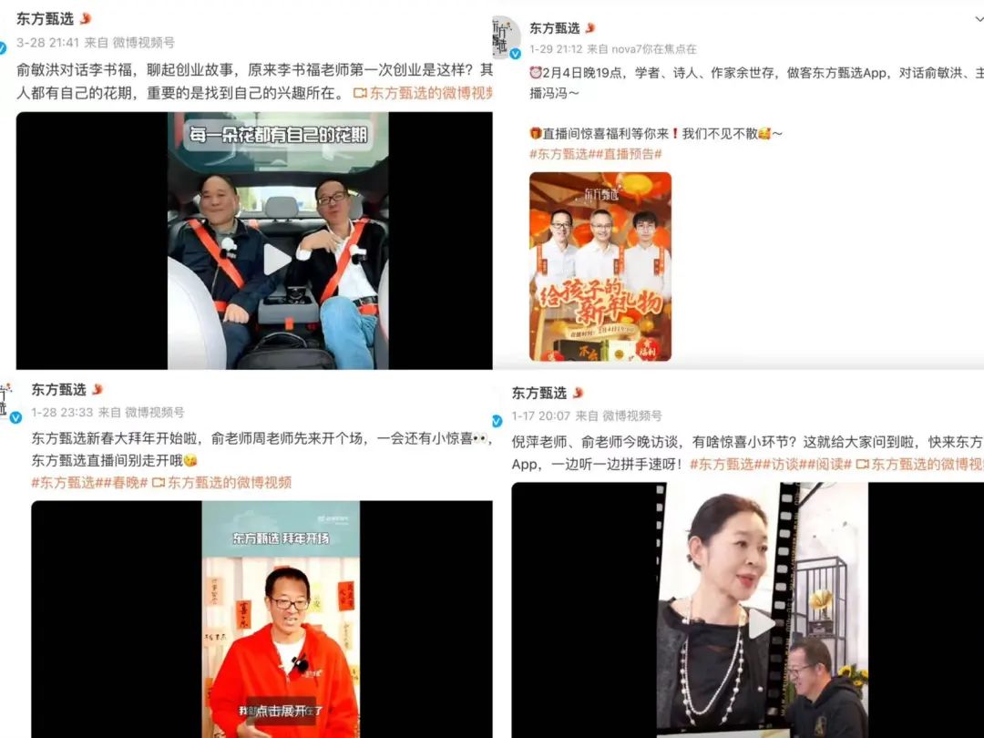 东方甄选微博账号发布的博文显示,俞敏洪今年4次出现在东方甄选直播间,分别是1月17日和倪萍的对谈直播、1月28日的新春拜年、1月29日和作家余世存的对话直播、3月28日的武夷山之旅(其中包括和企业家李书福的对话)。此外,俞敏洪也出现在了与辉同行直播间,和董宇辉一同前往湖北。