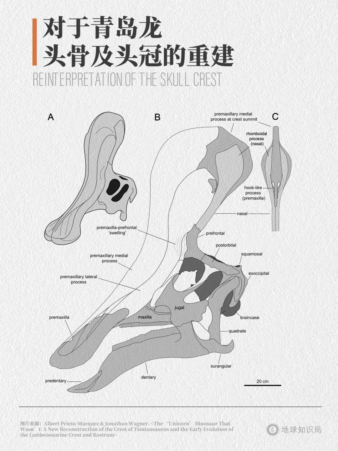 首先是“角”,根据最新研究发现,青岛龙脑袋上的“角”可能是一个更大的头冠后缘的一部分,只因为化石保存不完整,才造成了这个误会。