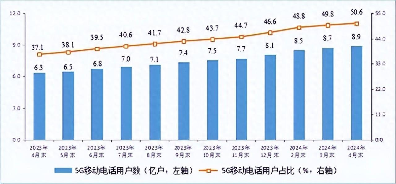 数据显示,截至4月末,三家基础电信企业及中国广电的移动电话用户总数达17.59亿户,比上年末净增1528万户。其中,5G移动电话用户达8.89亿户,占移动电话用户的50.6%,占比较上年末提高4个百分点。