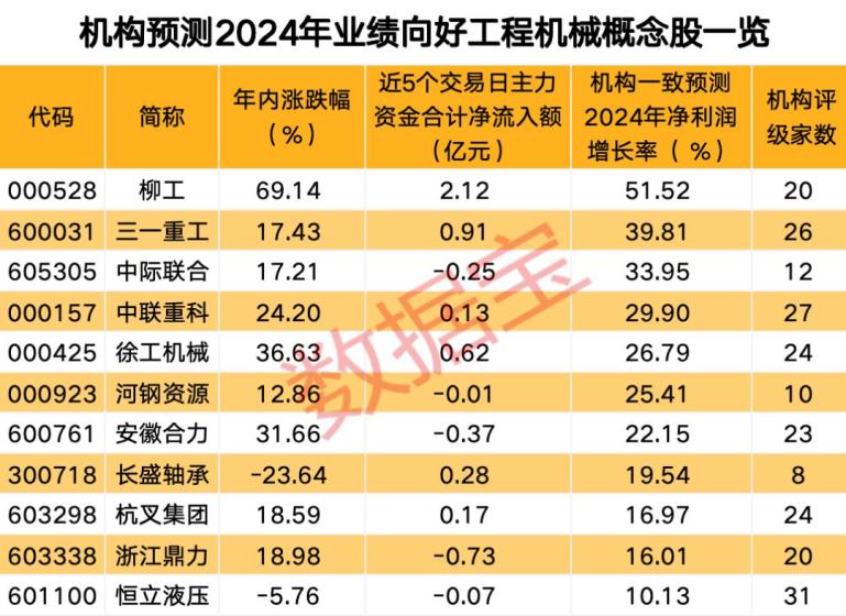 来源:数据宝挖掘机内销同比增长近三成,多只概念股获主力资金关注。
