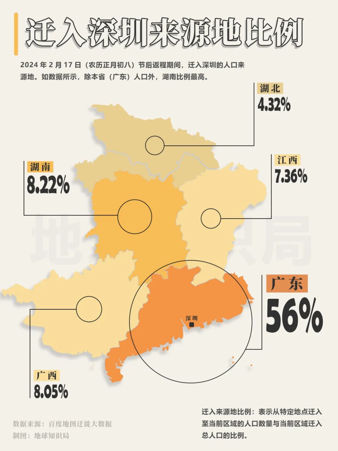2019年,深圳自然资源与规划局的调查数据显示,非户籍人口中的30.6%来自广东省内,13.9%来自湖南,居第二位,湖北则以9.6%,居第三位。(参阅《广东江苏浙江,都在虹吸谁?》)