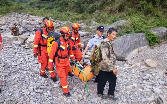 由于被困人员所处位置山路崎岖,地形复杂,有多处悬崖陡壁,增加了救援难度。消防救援人员带好安全绳、多功能担架、急救箱等器材,与当地村民和派出所民警一同徒步进山进行搜救。