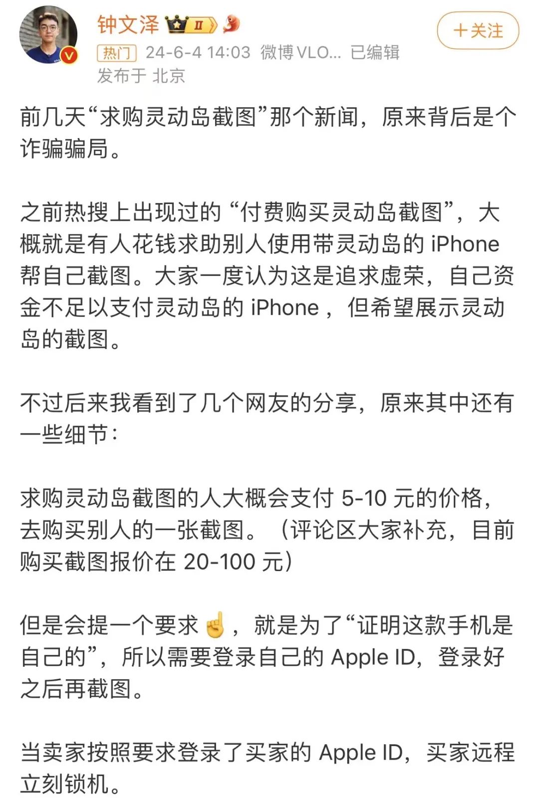 就前几天的事儿,有个博主在微博爆料说,灵动岛截图其实是个大骗局。但是骗人的,并不是卖灵动岛截图的人,而是那些求购截图的 “ 买家 ” 。