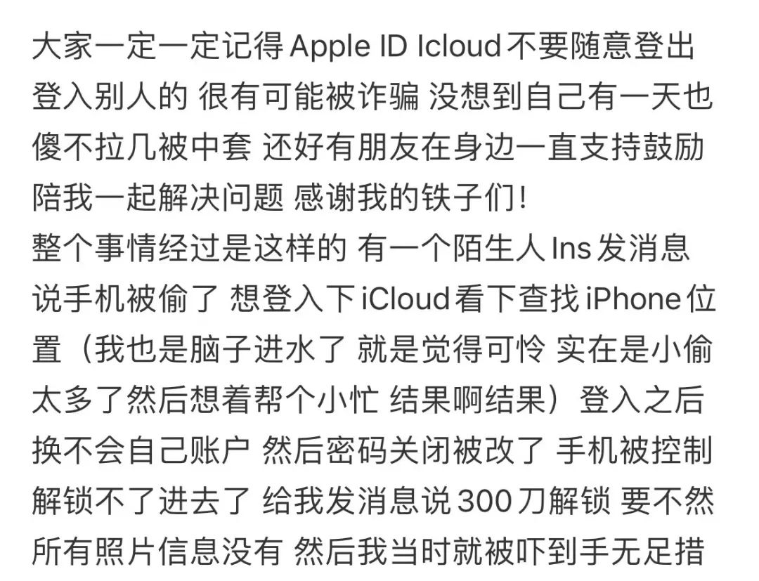 世超问了几名受害者,他们在登录骗子的 ID 之后,要不就是手机直接被锁,用备用机跟骗子联系,要不就是在被锁之前,骗子还留了几分钟威胁他们要钱。有些受害者想着多一事不如少一事,给对面转个几百块钱,结果可能钱搭进去了,手机也没解锁。