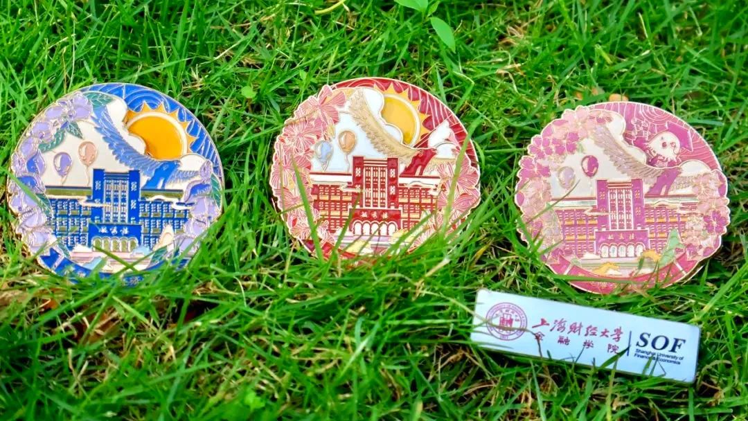 在徽章第二层精心设计了怀抱爱心的上财猫咪