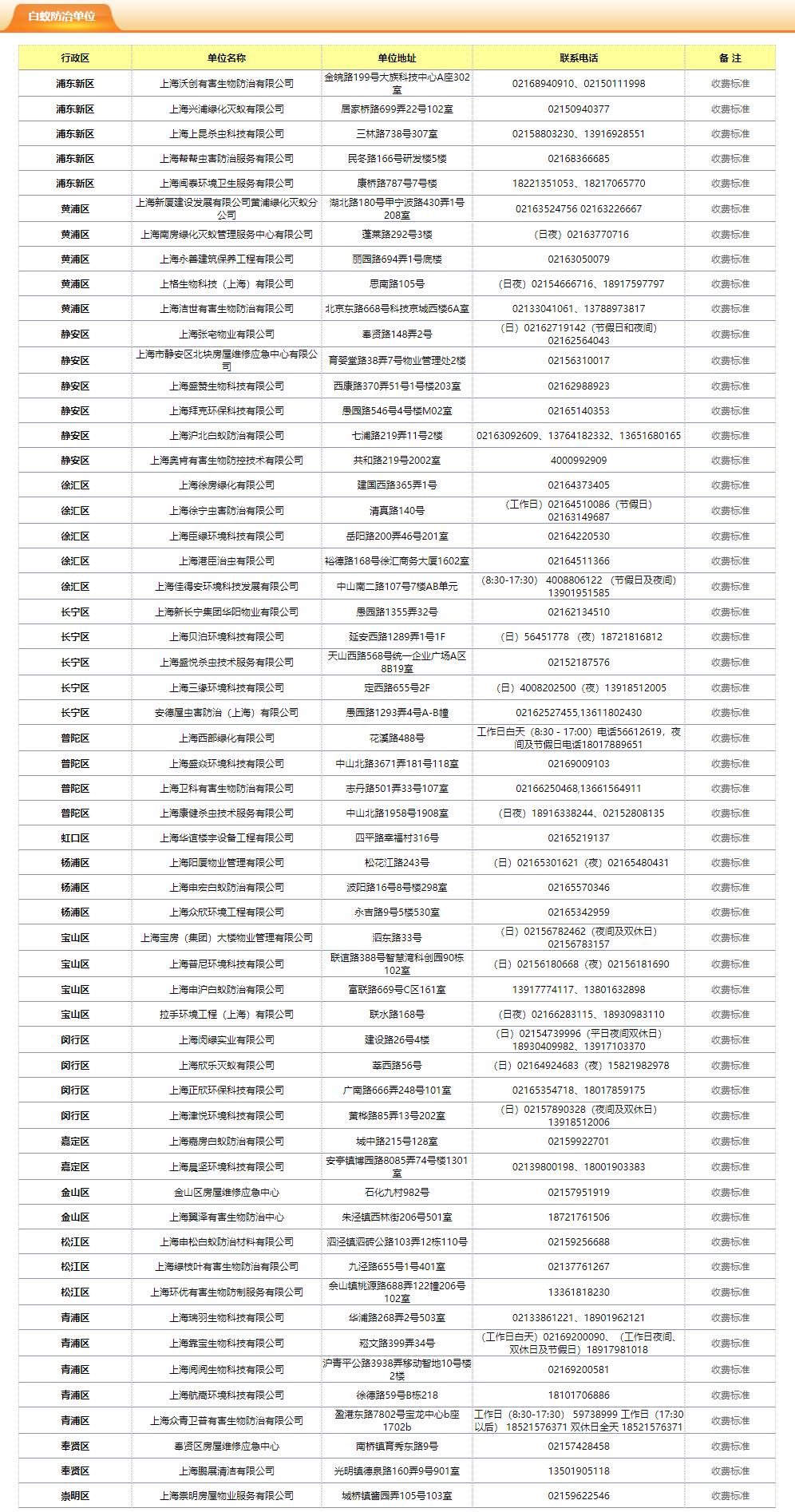 目前,上海16个区都有白蚁防治企业,市民可以通过“上海住宅物业网” “上海物业”微信公众号或小程序、物业服务热线,查询到正规的白蚁防治企业。记者了解到,物价管理部门未制定白蚁防治的收费标准,但各成员单位已将收费价格进行公示。相关管理部门表示,如果发现白蚁防治企业有未按公示的收费标准乱收费的,可拨打“962121”热线进行投诉。