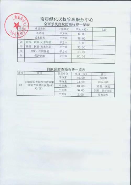 登录上海住宅物业网,发现各家备案的防治企业虽然价格已经公示,但报价不一,收费也是五花八门,各家说了算。比如上海崇明房屋物业服务有限公司,按照材料费与人工费进行报价,表格列明材料费50元/500克,防治人工费为每次600元/2人,查勘人工费为600元/2人。防治期内包治三年,三年内免人工费。而市中心的防治企业一般有“局部应急性灭治”以及“全屋系统性灭治”两套价格体系。在局部应急性灭治报价上,企业大多列明了木门、木窗、木楼梯等不同部位的灭蚁价格。而在全屋系统性灭治参考价格,有企业按照房屋建筑面积进行报价,有企业则按施工面积报价。以“南房绿化灭蚁管理服务中心”为例,其《局部应急收费一览表》显示,木门框(简易)为165元,木窗框为160元。其《全面系统白蚁防治收费一览表》显示,房屋结构分木结构(每平方米45元)、砖木结构(每平方米38元)、砖混、钢筋结构还要再分有无木制品,每平方米分别是30元、15元;别墅、花园为每平方40元,保护建筑为每平方80元。另外,一家备案企业“上海拜克环保科技有限公司”,其灭治价格参考显示,“全面预防”按房屋面积进行整体报价,50-100平方米报价1000-2000元,100-150平方米的房屋报价为2000-3000元。