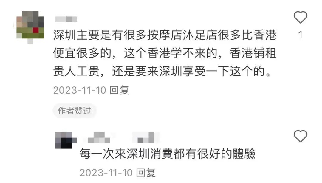 △可以说,比深圳本地人更懂SPA馆的非香港人莫属。(图/小红书截图)初来乍到的香港消费者甚至还因为给小费的习惯,不小心搅乱了深圳的市场行情,逼得人均普通话的深圳网友,紧急用现学现卖的散装粤语喊话对岸: