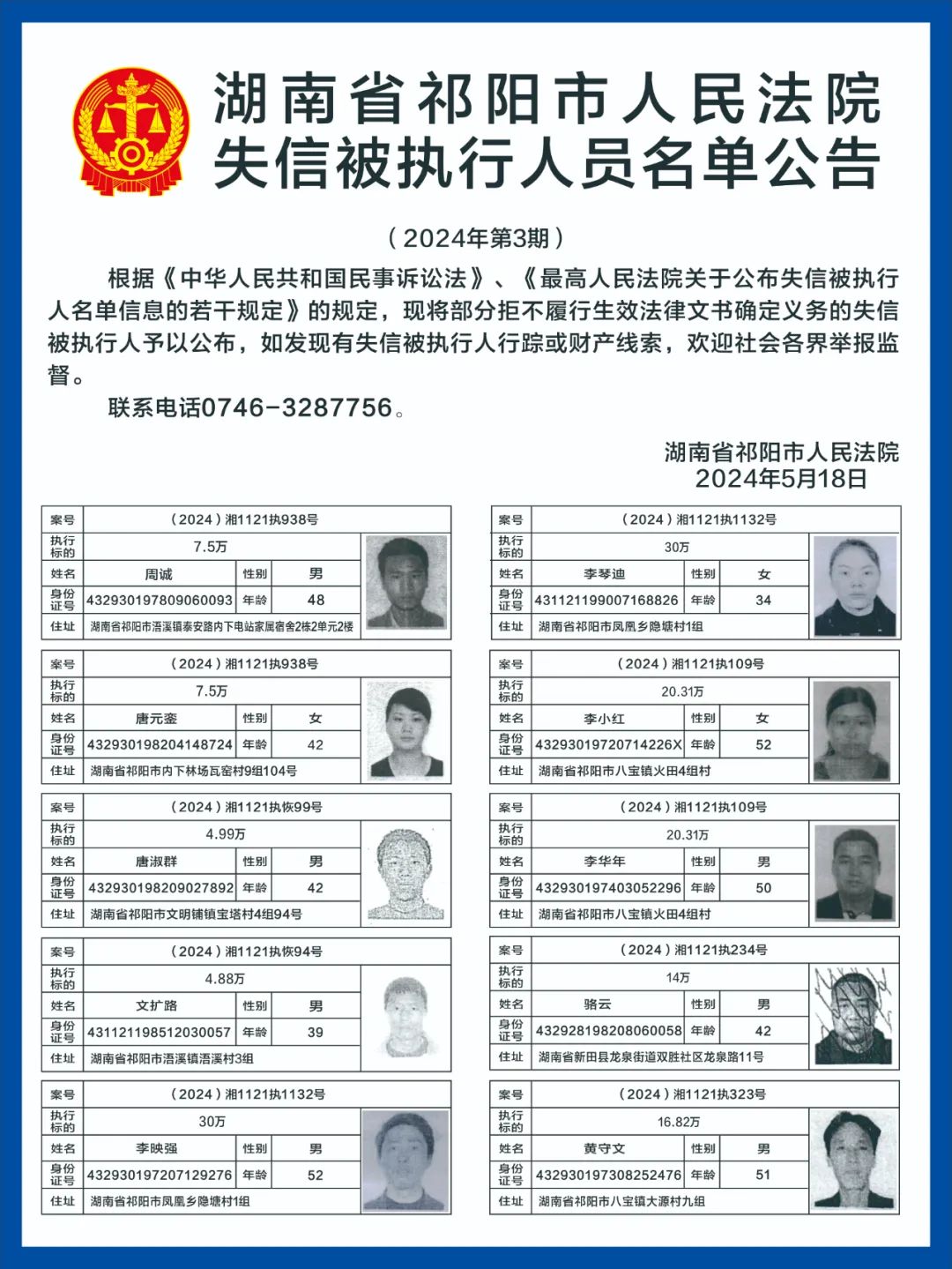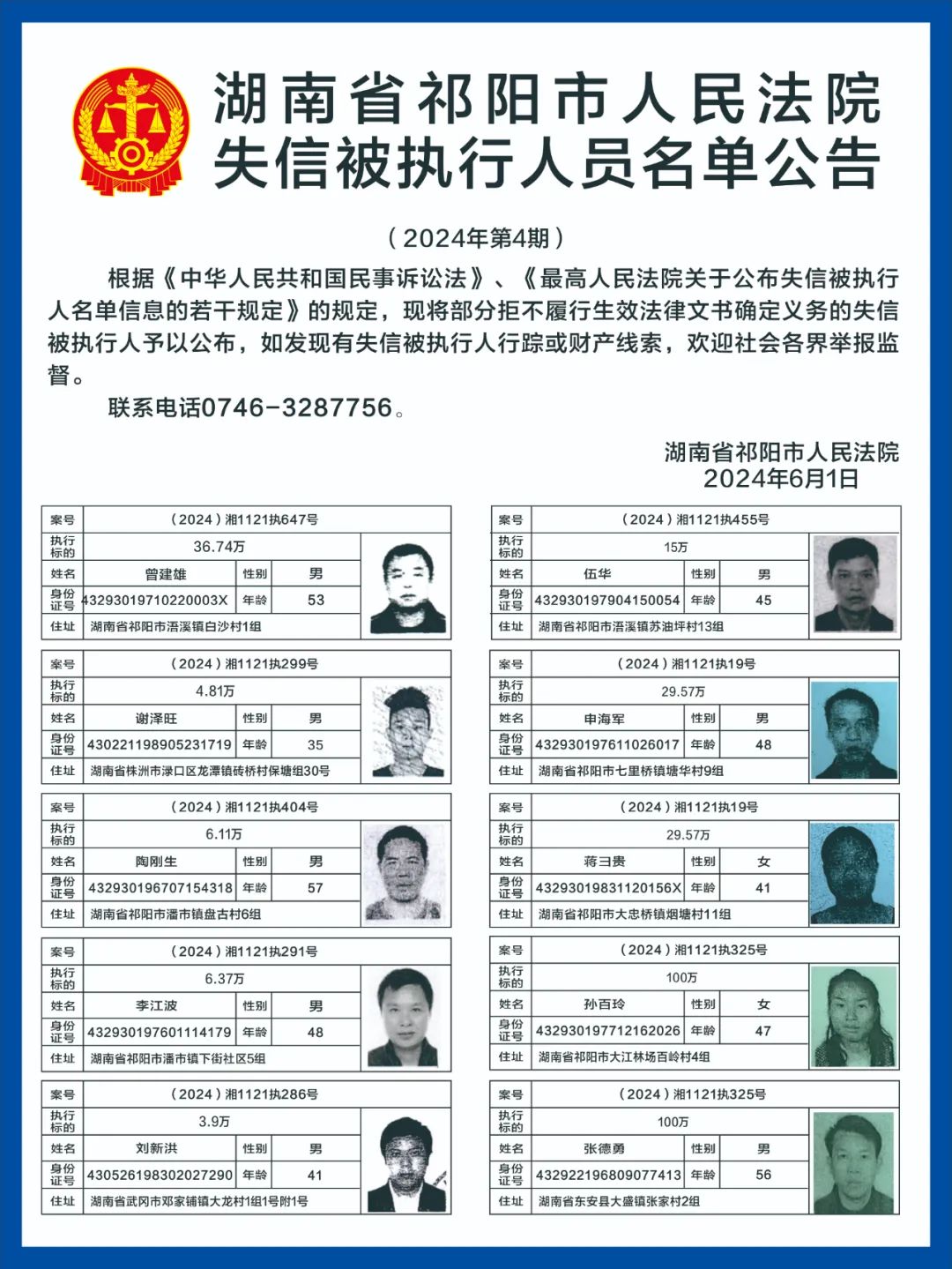 原标题:《祁阳市人民法院公布2024年第3期、第4期失信被执行人名单》