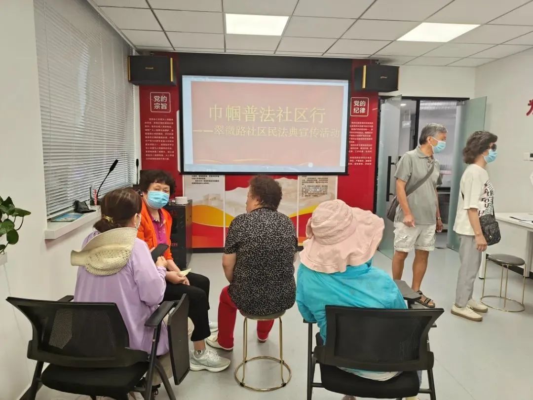 翠微路社区联合北京信杰律师事务所的专业律师开展了“巾帼普法社区行”法律知识普及活动,用生动的案例和通俗易懂的语言,向居民们讲解了《婚姻法》《妇女权益保障法》《民法典》等相关法律法规,并向居民发放了相关普法资料。