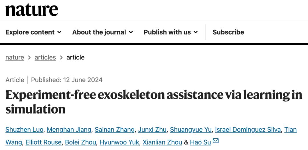 2024年6月12日,北卡罗来纳州立大学苏浩团队在 Nature 期刊发表了题为:Experiment-free exoskeleton assistance via learning in simulation 的研究论文。
