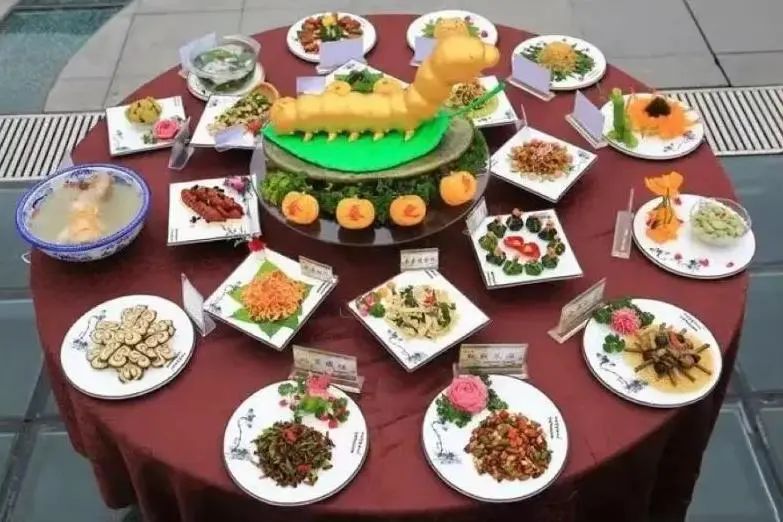 八道凉菜、八道热菜、两道汤菜、两道小吃共二十道菜品展现金蚕从桑养到长大、吐丝、破茧、成蝶的进化过程,将金蚕小镇丰厚的桑蚕文化通过食物形象生动地表达出来。