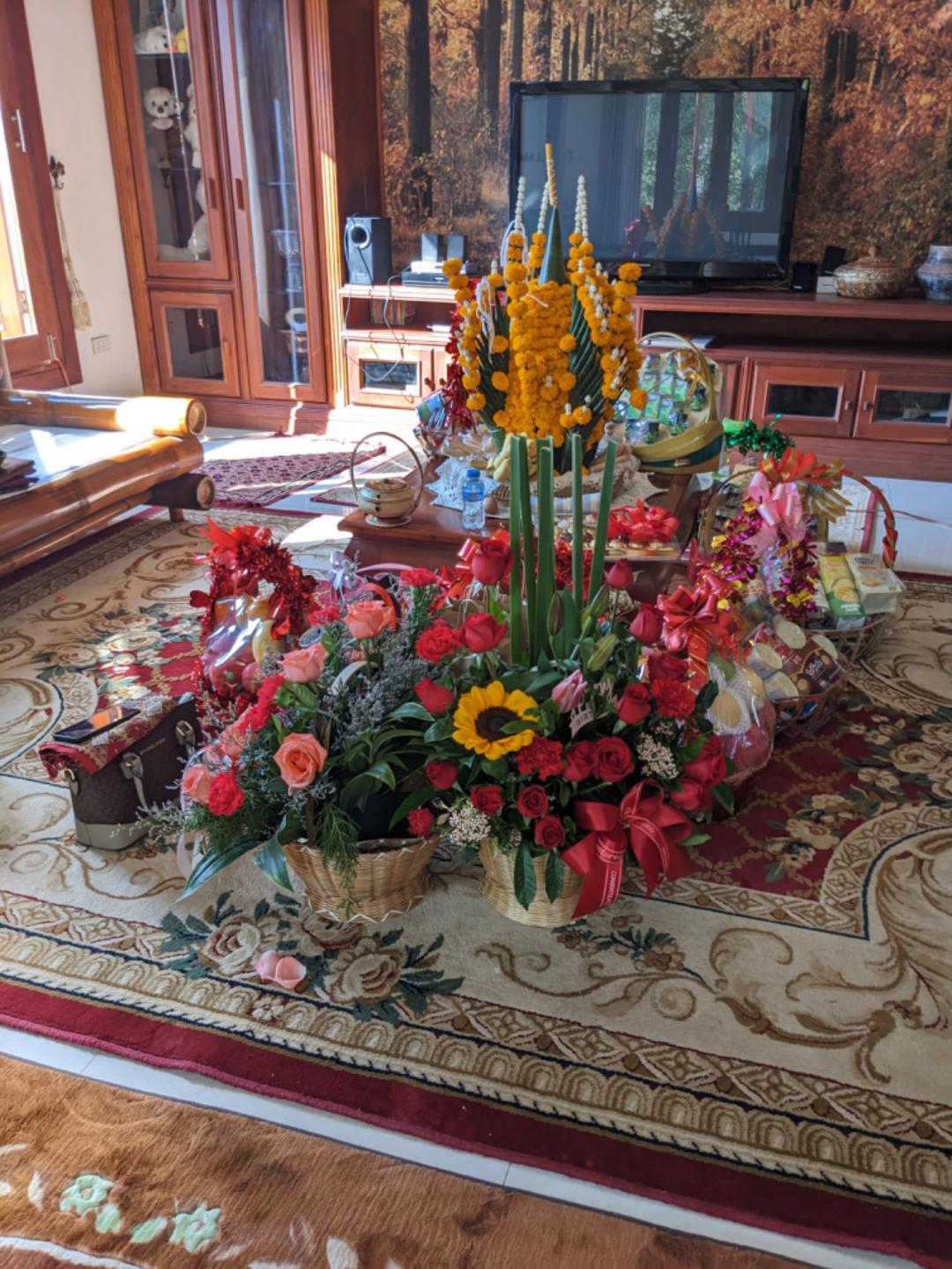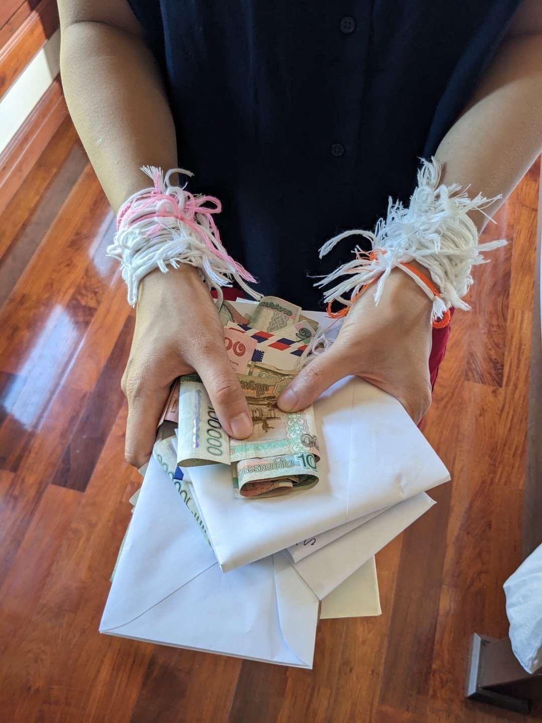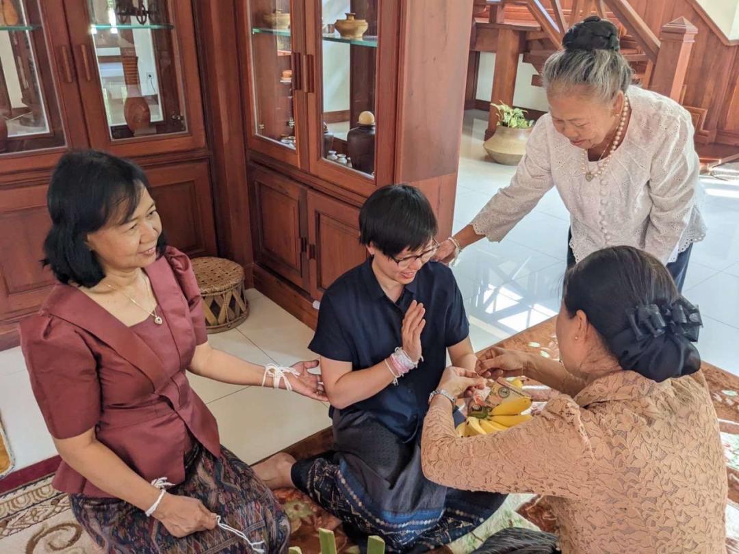 休整几天后,我们迎来了这次拜访的重头戏。为了欢迎久别重逢的亲人和即将来世的小宝宝,公公婆婆在家举行了隆重的Sut-Khuan祝福仪式。仪式由专业的颂魂师主导,众多受到邀请的亲朋好友前来,身着传统服饰,席地围坐在魂盘周围。等到颂师祝颂毕,众人便从魂盘上取下颜色各异的棉线,为我们在手腕上拴结。栓结之前,要先在手腕上左右划三下,象征着划走厄运,划来好运。系上绳结后,再搓揉绳头,嘴里也要不停地说着祝福的话语。