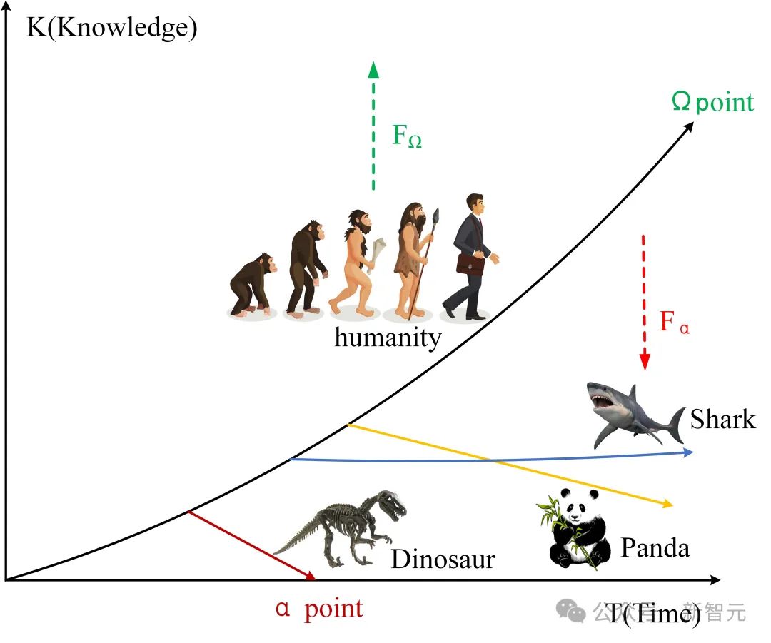 在自然界中,存在众多系统或智能体向α点或Ω点演化的案例,反映出其背后存在受α引力和Ω引力作用的迹象。例如,人类在过去20万年中,尤其是近几个世纪,其处理知识的能力经历了大幅度的提高,展示出向Ω点演化的趋势。另一方面,恐龙因自然灾害破坏了它们的生态系统,从而整个种群逐步演化为α点,彻底灭绝。熊猫由于环境挑战和自身问题,目前正处于濒危状态,从而趋向于α点。鲨鱼在数亿年的进化过程中保持稳定,其处理知识的能力变化甚微。