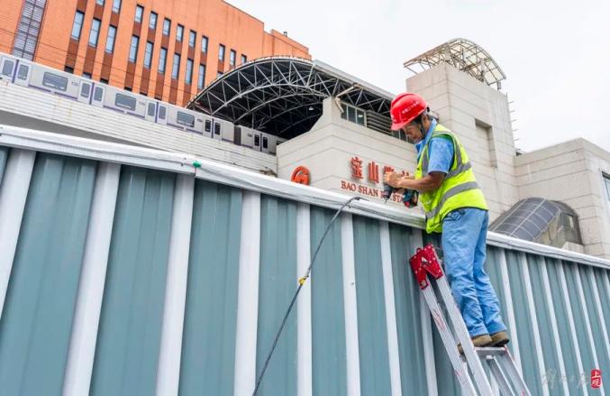 新开通的宝山路站3号出入口施工隔离板上