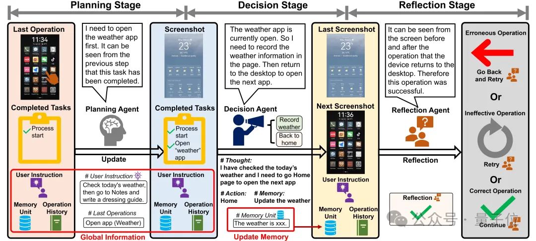 因此,Mobile-Agent-v2引入了记忆单元,并由决策智能体更新单元内的任务相关信息。此外,由于决策智能体无法观察操作后的屏幕信息,Mobile-Agent-v2引入了反思智能体来观察决策智能体操作前后的屏幕状态变化,并决定操作是否正确。