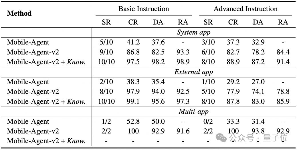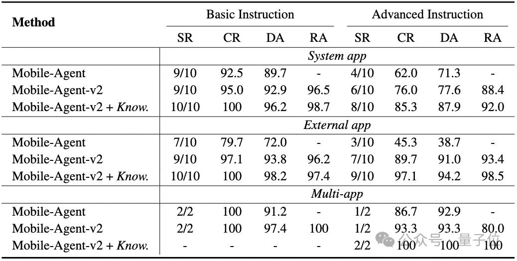 此外,通过人工引入额外的操作知识,能进一步提升性能(Mobile-Agent-v2 + Know.)。