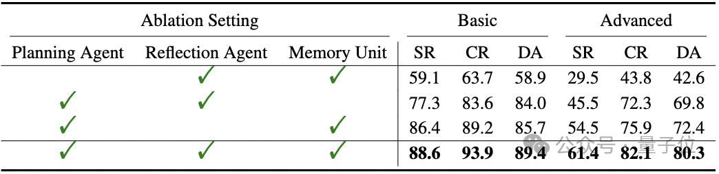 作者在文章中展示了消融实验的结果,如下表所示,在去除规划智能体、决策智能体和记忆单元后,整个智能体的性能都出现了下降。