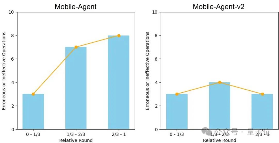 如下图所示通过分析操作失败的任务,作者发现Mobile-Agent的失败操作大量集中在后程,而Mobile-Agent-v2则相对平均。这说明了Mobile-Agent-v2能更有效地解决长序列带来的问题。