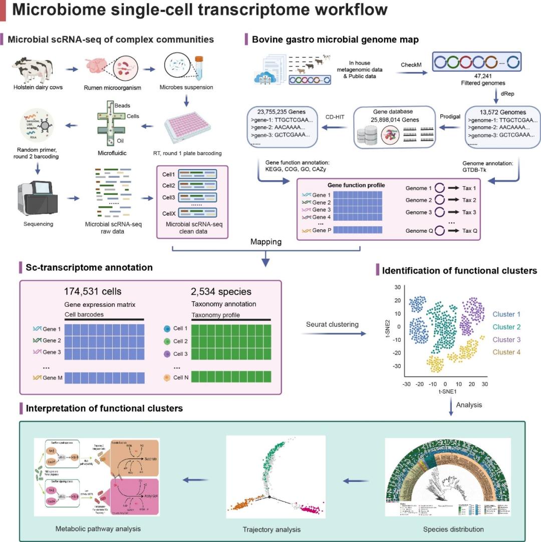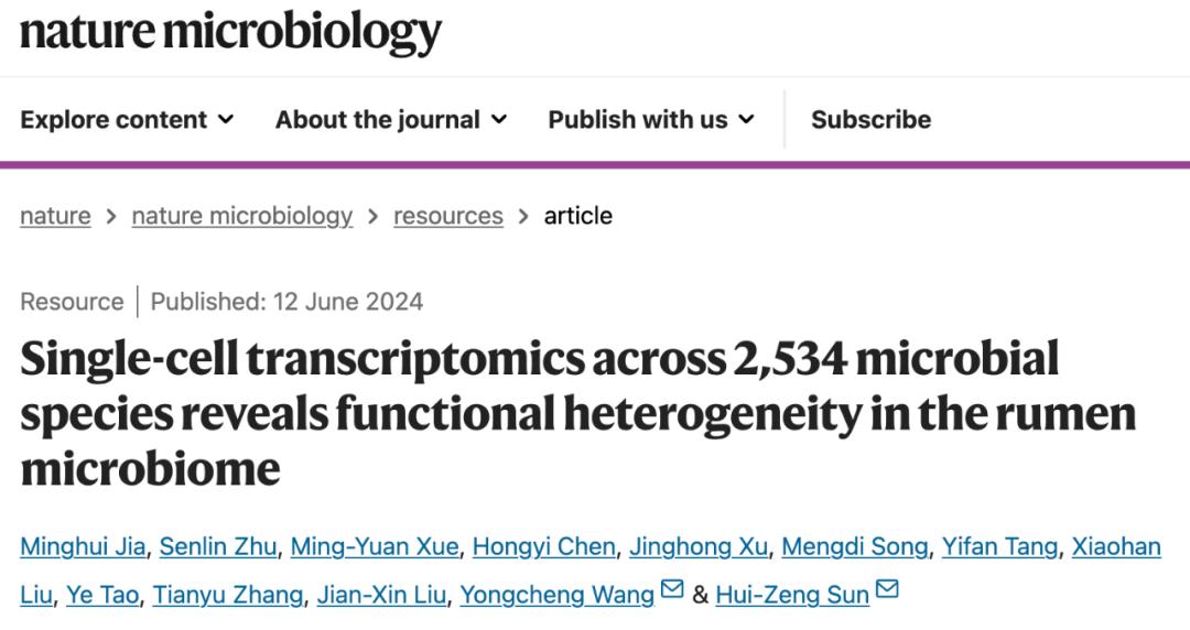 2024年6月12日,浙江大学动物科学学院奶业科学研究所孙会增课题组与浙江大学良渚实验室王永成课题组合作,在 Nature Microbiology 期刊发表了题为:Single-cell transcriptomics across 2,534 microbial species reveals functional heterogeneity in the rumen microbiome 的研究论文。