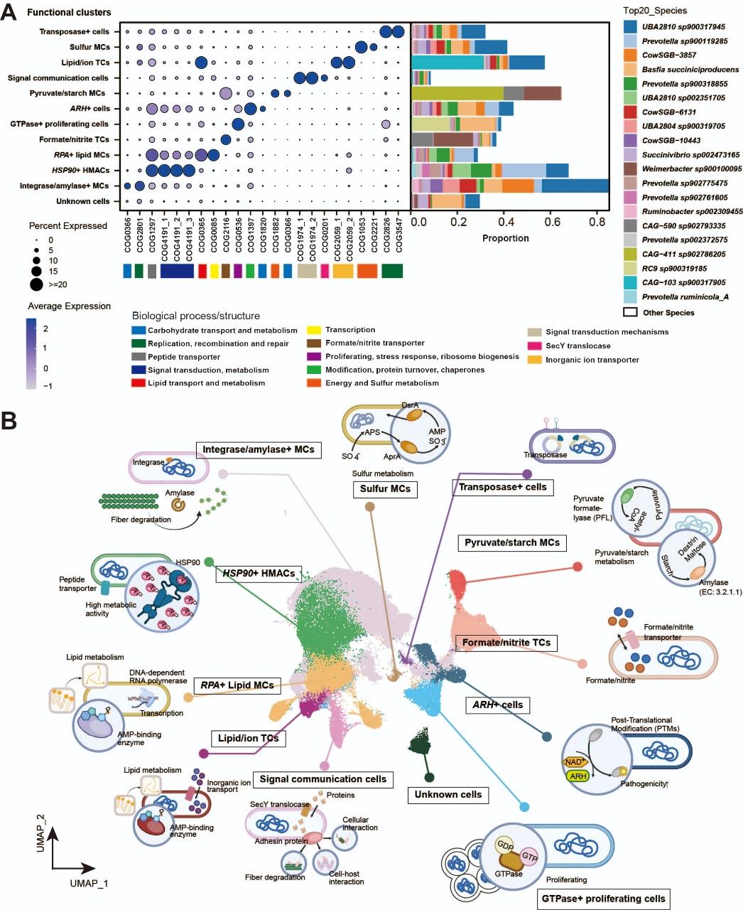 图1. 微生物组单细胞转录组研究流程基于MscT,研究团队构建了一个涵盖17,4531个微生物细胞和2,534个物种的瘤胃微生物单细胞转录组图谱,揭示了瘤胃微生物在单细胞水平上的功能分工;共鉴定出12个功能类群,每个类群由表达特定代表性功能基因的细胞组成。例如,功能类群“HSP90+ HMACs”中的细胞特异性表达HSP90蛋白,这些基因与ATP利用相关,表明该类群具有高代谢活性。在识别出的172个核心活性物种中,有164个物种分布在多个功能类群中,其中38个物种存在于全部功能类群中;同时,部分物种被发现主要分布于特定功能类群,例如Desulfovibrio sp016284885主要参与硫代谢,而Sodaliphilus sp900318205则主要参与脂类代谢。不同微生物物种在不同功能类群中表现出特定的活性,反映了其生态功能的多样性。