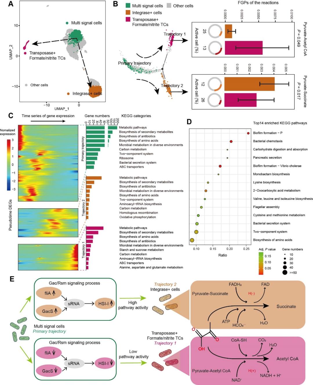 图3. 瘤胃碳水化合物代谢功能异质性在此基础上,该研究提取了5591个Basfia succiniciproducens的细胞深入探究其代谢功能变化轨迹,基于瘤胃微生物从底物到最终产物的生物学过程,预测细胞代谢状态变化轨迹为:“从初始轨迹(Multi signal cells)到轨迹1(Transposase+ Formate/nitrite TCs)和轨迹2(Integrase+ cells)”,拟时序差异基因分析证实了这种转化。结果发现,轨迹1细胞的“丙酮酸到乙酰辅酶A”代谢活性显著较高,而轨迹2细胞的“丙酮酸到琥珀酸”代谢活性显著较高。丙酮酸是碳水化合物代谢的关键中间物质,其代谢过程与瘤胃微生物氢代谢密切相关,丙酮酸代谢生成琥珀酸可降低氢的生成,对瘤胃甲烷减排意义重大。以上结果提示,基于基因表达的微生物细胞状态变化在代谢表型研究中具有巨大潜力。