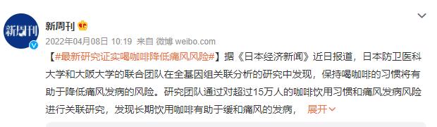 (图片来源:微博截图)这是因为咖啡中含有的咖啡因能抑制尿酸产生所需的酶(黄嘌呤氧化酶),从而减少尿酸生成,痛风也就不容易发作了。