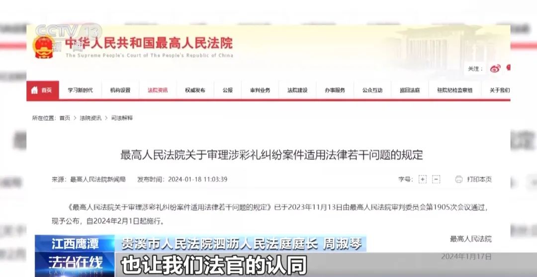 贵溪市人民法院泗沥人民法庭庭长 周淑琴:整个司法解释内容对于彩礼的认定,对于符合彩礼返还的情形,有了更加详细的解释,也让我们基层法官在审理此类案件中有了更多的指引和方向。法院判定女方返还彩礼共计6万余元