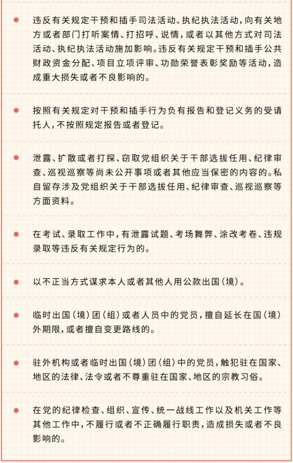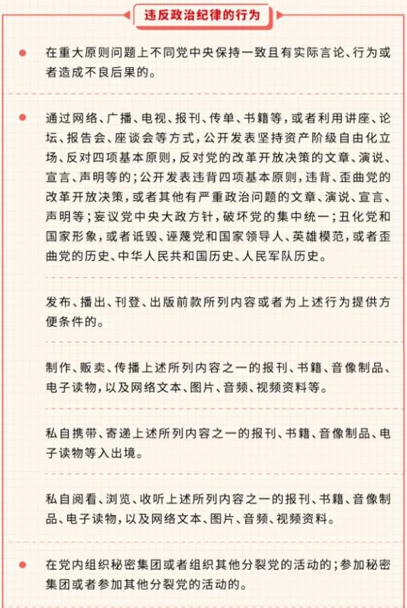 新修订的《条例》罗列了百余条纪律“底线”,将中共党员在生活中的“负面清单”清晰列出,再次阐明了“六大纪律“的重要意义。